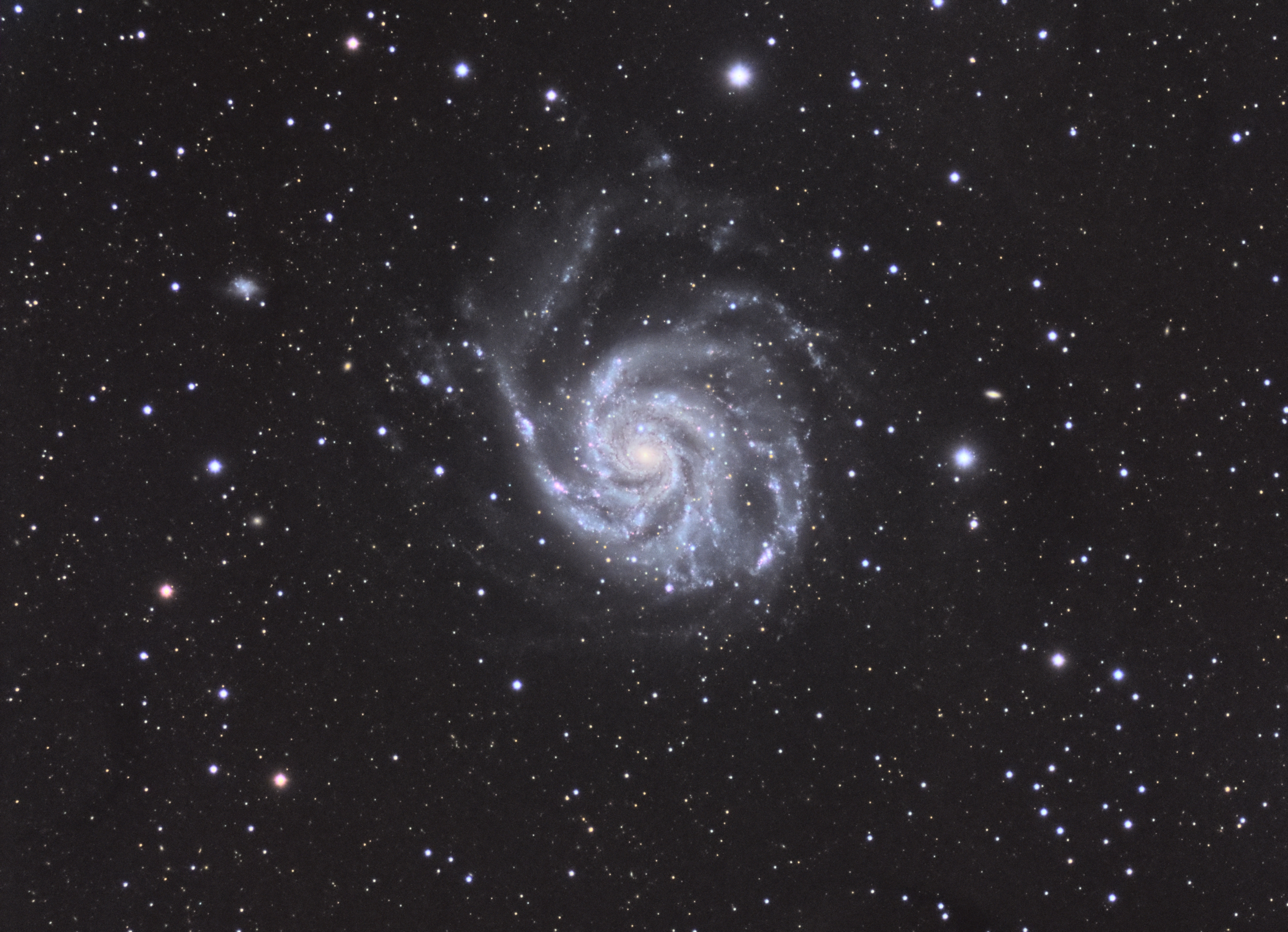 M101, également appelée NGC 5457 ou galaxie du Moulinet, est une galaxie spirale située dans la Grande Ourse et distante d’environ ∼23 millions d’AL. Le diamètre de cette galaxie (170 000 AL) est de 70 % plus grand que celui de notre Voie Lactée (100 000 AL) pour une masse stellaire de l’ordre de 1 000 milliards de masses solaires, environ dix fois la masse de notre galaxie.