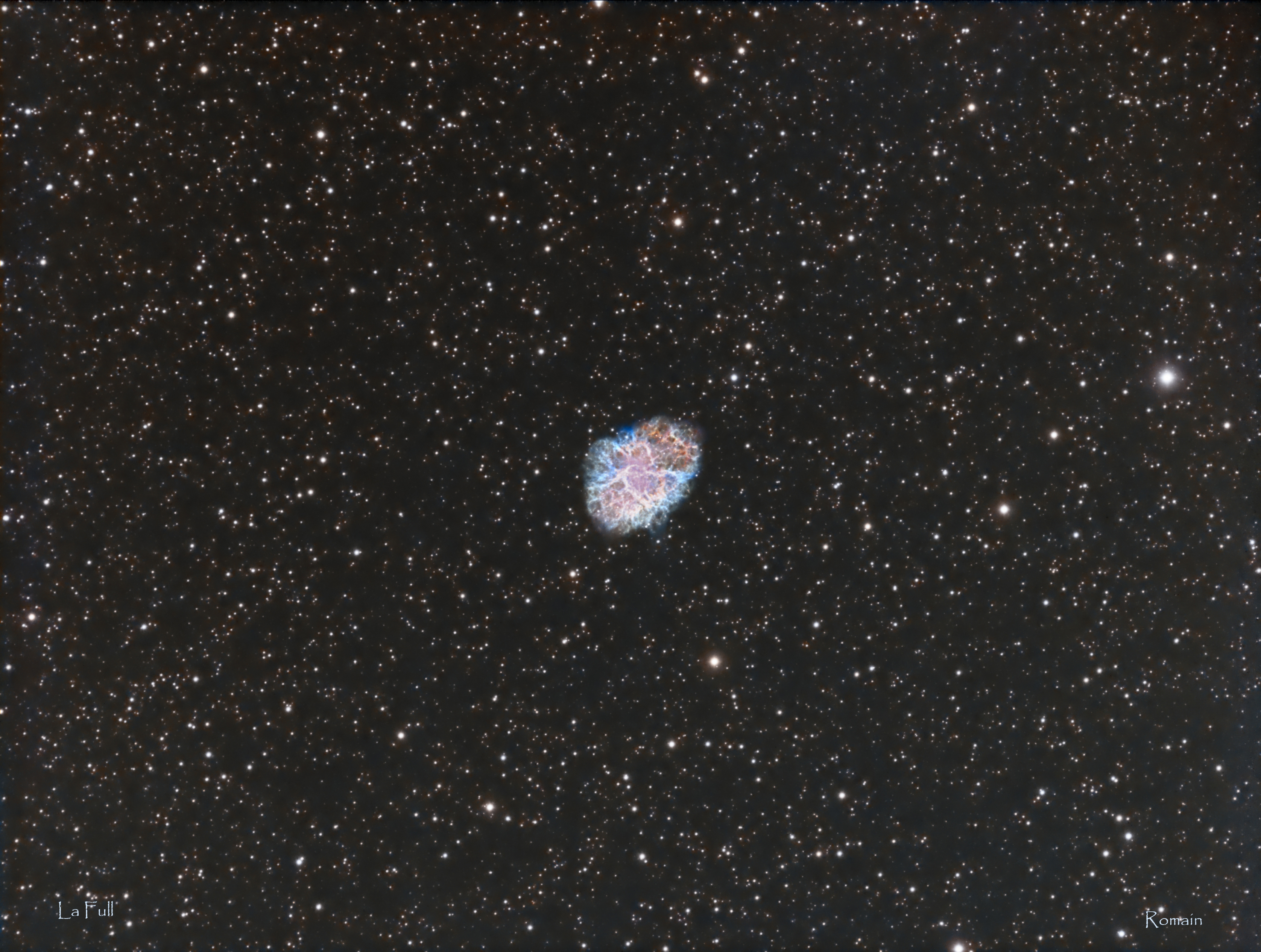 Appelée aussi « la Nébuleuse du Crabe », M1 est assez proche de la terre à environ 6300 AL, dans la constellation du Taureau. M1 est le vestige d’une supernova, résidu de l’explosion d’une étoile massive en fin de vie. Nous savons aujourd’hui que l’étoile qui a explosé ce jour là s’est effondrée en étoile à neutrons et l’on peut observer un pulsar en son centre qui émet des impulsions à la fréquence de 30Hz. C’est le pulsar le plus énergétique connu à ce jour, il rayonne 200 000 fois plus que notre soleil et dans une large bande de fréquence.