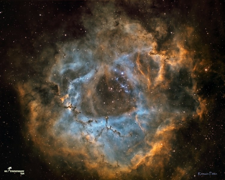 Un groupe de six étoiles centrales brillantes composent l’amas ouvert NGC 2244, ces étoiles jeunes de type O nées, il y a environ 4 millions d’années, émettent un rayonnement ultraviolet qui ionise l’hydrogène du nuage environnant, dont la dominante sera donc de couleur rouge. La dispersion du gaz, par la pression de radiation de ces jeunes étoiles très chaudes, fait ressembler cette nébuleuse à un ensemble de feuilles qui entourent le cœur d’une plante, d’où son nom ‘’ la nébuleuse de la Rosette’’.
