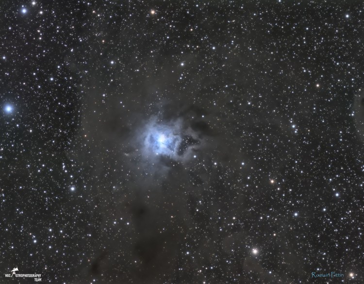 Nommée également la nébuleuse de l’Iris, elle se distingue par sa couleur bleue issue des grains de poussière qui diffusent la lumière émise par les jeunes étoiles très chaudes et notamment celle qui est au centre de l’amas.