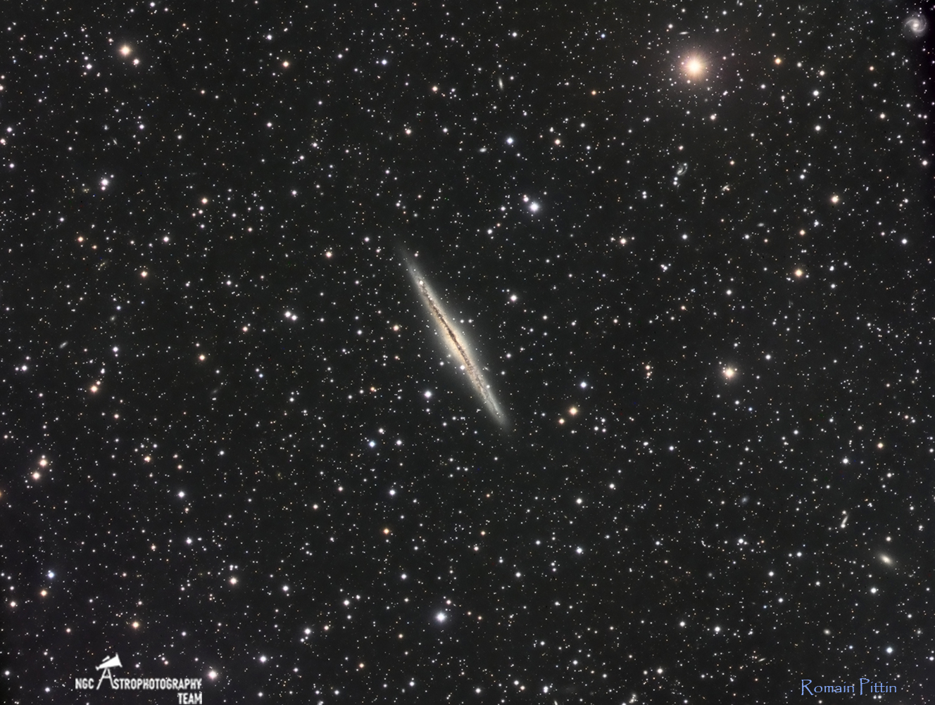 NGC891, est une galaxie spirale vue par la tranche, située dans la constellation d’Andromède. Elle fait partie du super Amas de la Vierge et elle est éloignée de nous entre 22 et 32,5 millions d’AL, selon le système de mesures.