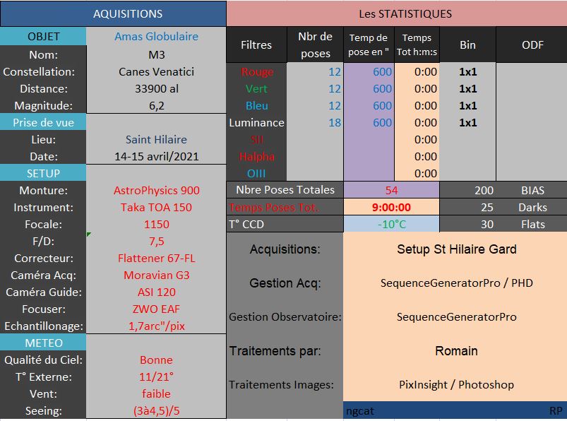 Acquisitions novembre 2021 à Fregenal (Es), de: Ha 18x1200s, OIII 22x1200s, SII